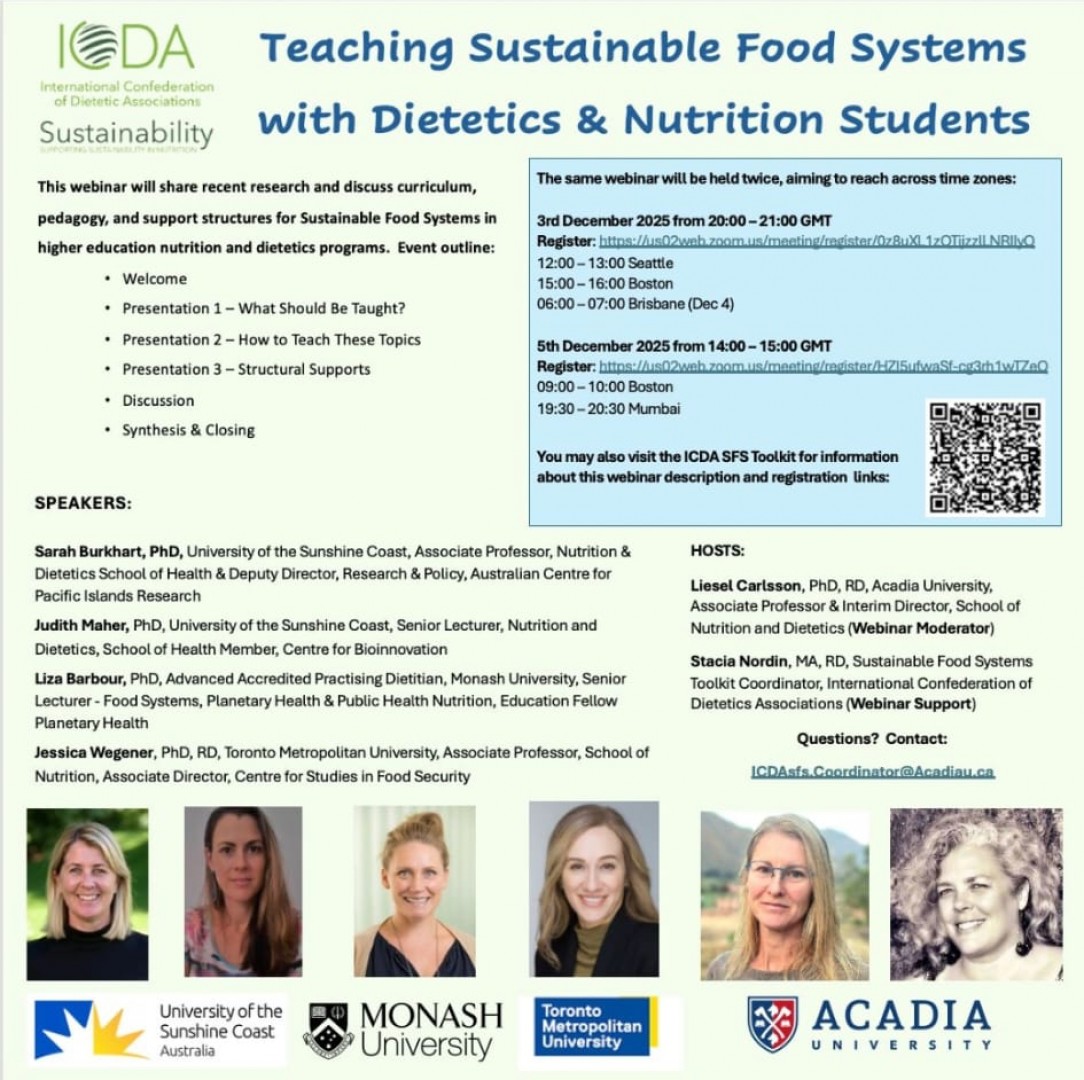 This webinar will share recent research and discuss curriculum, pedagogy, and support structures for Sustainable Food Systems in higher education nutrition and dietetics programs. The following webinar will be repeated on the 4th & 5th Dec 2025, register for any one of the sessions provided.